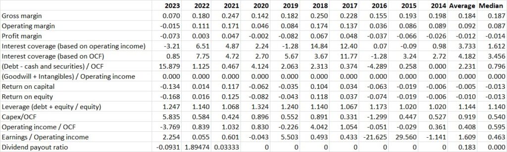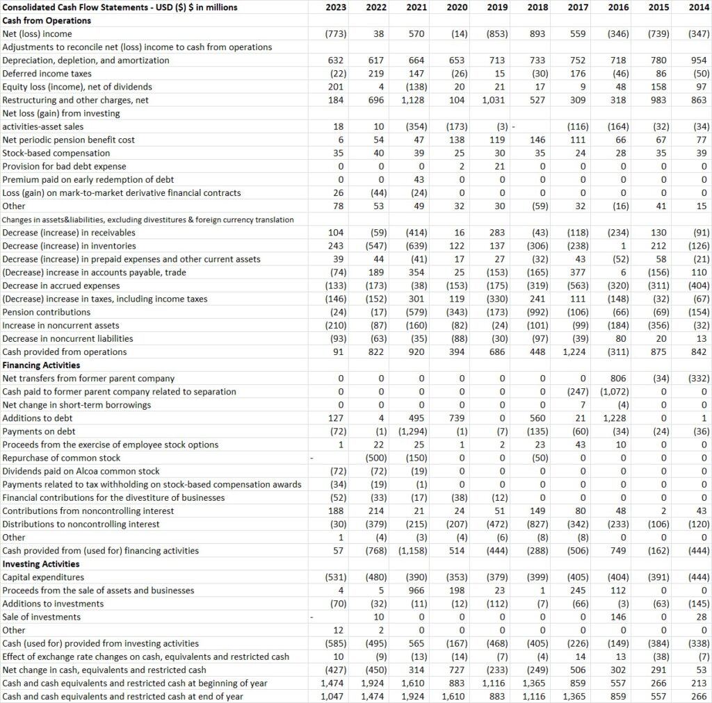 Figures 1, 2, and 3 show the income statement, the cash flow statement, and the balance sheet, respectively, for Alcoa for the past 10 full years (2014 – 2023). Prior to 2016 portions of Alcoa that make finished aluminum parts were spun off, so we will just be looking at the mining and refining business. Results for 2015 were provided in the annual report for Alcoa based on the mining and refining business only and excluding the spun off entity. There was no balance sheet data provided for 2014, so we will use the 2015 balance sheet numbers as an approximation to provide some data for 2014. The cash flow statement and income statement data were provided for the 2014 fiscal year, so we don’t need to make any approximations with those numbers.