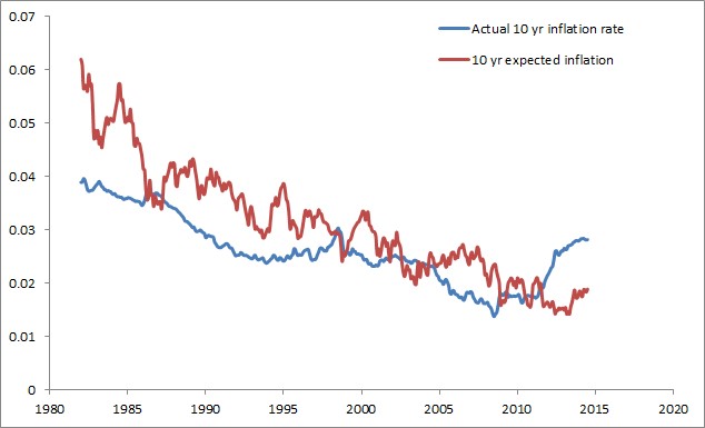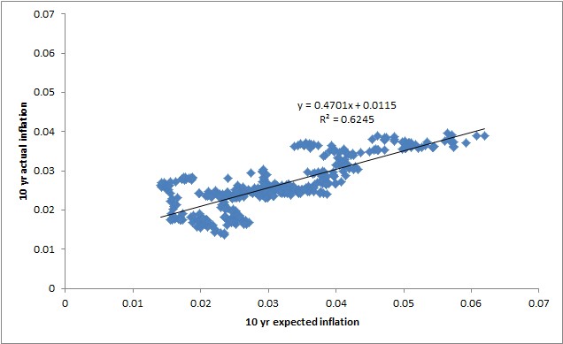The best predictor of future 10 year inflation that I have found is the 10 year expected inflation rate data published by the Federal Reserve Bank of St. Louis here. The annualized 10 year expected inflation is shown alongside the actual annualized 10 year inflation rate in Figure 1.