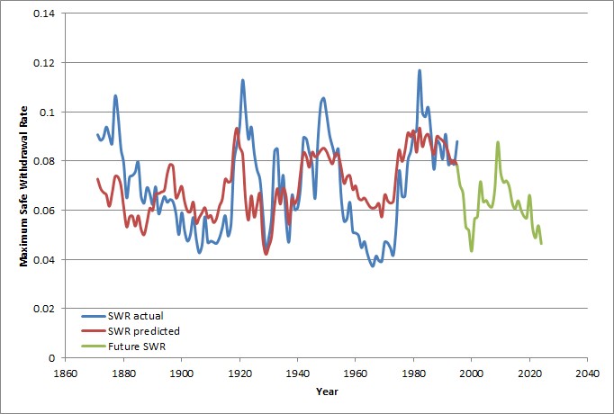 Given that we have a model which is decent at predicting real returns using the equity allocation of investors and the inverse of the 10 year treasury bond yield (1/GS10) we should reasonably be able to predict the maximum safe withdrawal rate that can be utilized in retirement. Figure 2 shows the model fit for a 80% stocks / 20% bond allocation for a 30 year retirement. As you can see, the fit is excellent, but there is a problem. The model is giving rather odd future predictions. It is giving a maximum safe withdrawal rate currently of 2%. This is probably far too low, since the worst year ever, historically speaking, was 1966, and the safe withdrawal rate in that year only fell to 3.7%. That was a particularly bad year to retire because the following decade would be marked by high inflation and poor economic growth (stagflation) – a double whammy on a retirement portfolio. Further, the high inflation even continued into the next decade, once the growth started to normalize.