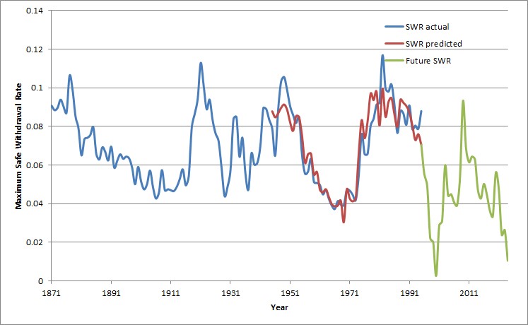In the last few posts, we have shown some techniques for predicting nominal returns and real returns. We have also looked at simulating safe withdrawal rates in retirement with various stock / treasury bond allocations and lengths of retirement. Now it is time to put all of this together and develop a model for predicting the maximum safe withdrawal rate for retirement based on current market conditions. We essentially want to know how much we will need to have saved given the current state of the market and future expected returns.